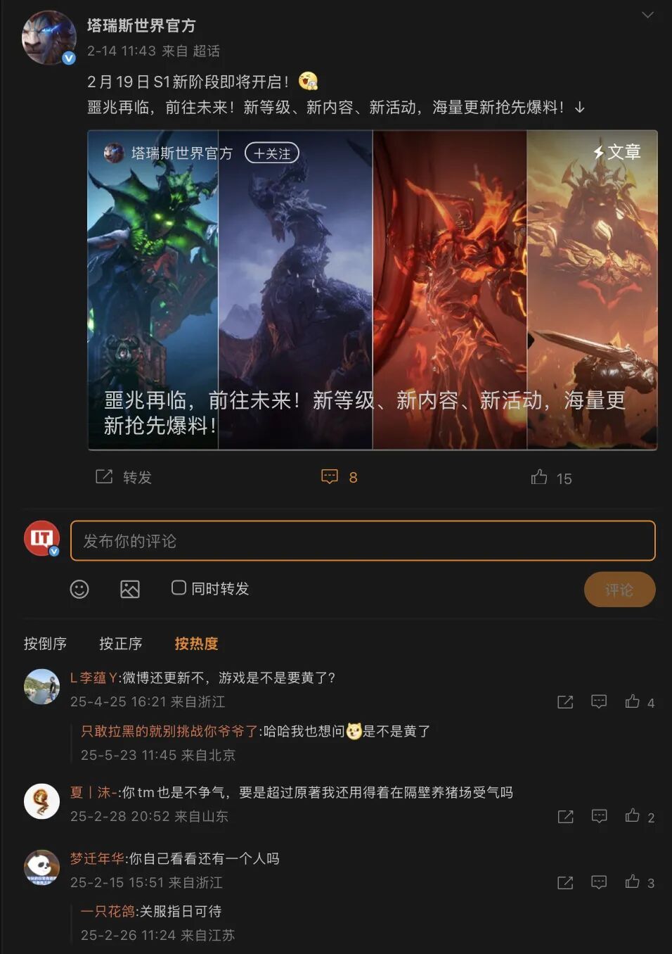 据悉,国服官网和微博也已半年未更新,玩家猜测“关服指日可待”。