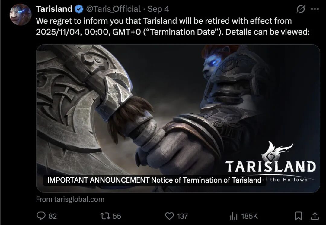 我们很遗憾地通知您,《塔瑞斯世界》将于2025年11月4日00:00(GMT+ 0)起停止服务(“终止日期”)。不同时区的计划终止日期如下: