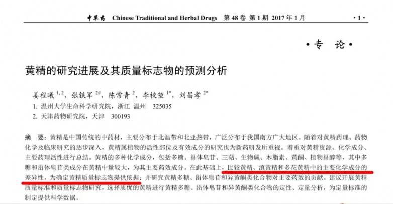 在《中草药》第48卷第1期(2017年1月)刊发的专论《黄精的研究进展及其质量标志物的预测分析》中论述:“黄精是中国传统的中药材,......(多花黄精)应用最优。”“姜形黄精的原植物为多花黄精,鸡头黄精的原植物为黄精,而大黄精(又名碟形黄精)的原植物为滇黄精。三者中以姜形黄精质量最佳。”