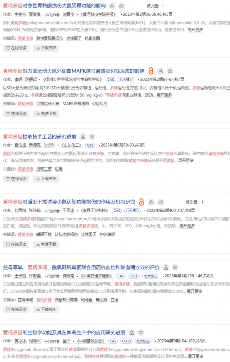 《食品与发酵工业》2022年第8期记载:“研究多花黄精炮制前后不同极性部分的抗氧化活性及对α-葡糖糖苷酶的抑制作用……该研究结果为药食同源植物多花黄精作为降血糖食品和天然抗氧化剂提供了理论依据。”