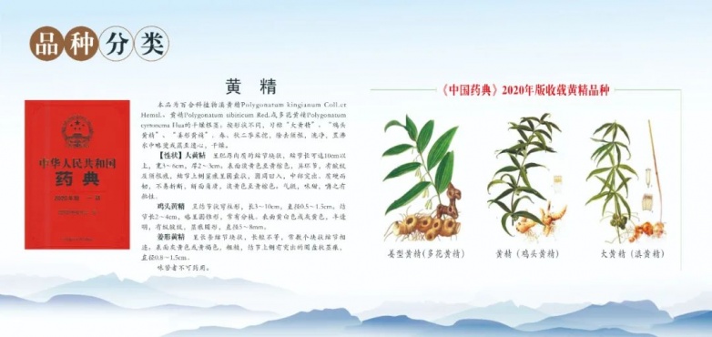 黄精始载于《名医别录》,2020年版《中国药典》规定黄精来源于百合科植物滇黄精Polygonatum kingianum Coll. et Hemsl、黄精Polygonatum sibiricum Red.或多花黄精Polygonatum cyrtonema的干燥根状茎,根据形状不同,其药材分别习称为“大黄精”“鸡头黄精”“姜形黄精”。