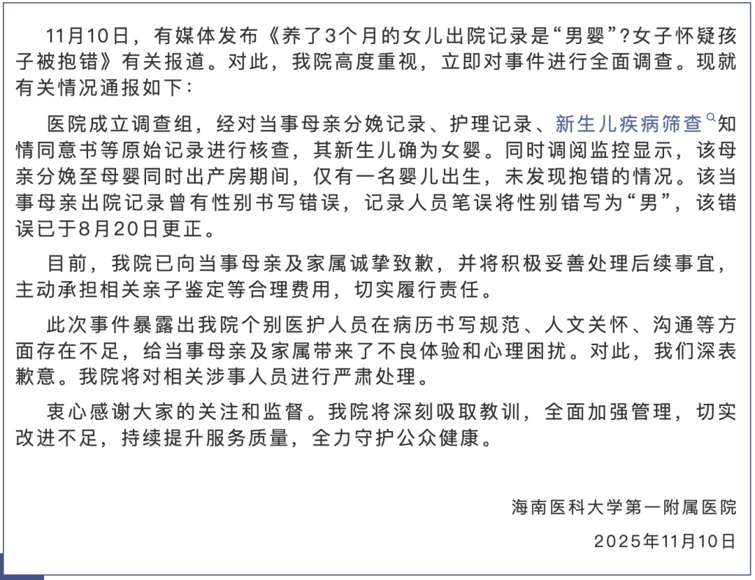 11月10日晚,海南医科大学第一附属医院发布关于“女子怀疑孩子被抱错”事件的情况通报。