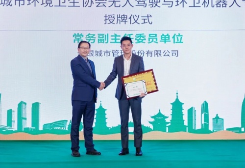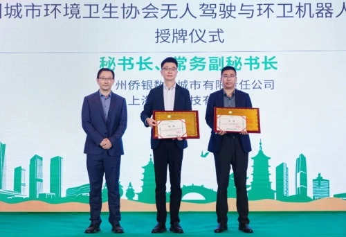 会上,中国城市环境卫生协会副会长兼秘书长刘晶昊正式宣读专委会成立批复文件及组织架构名单,标志着“无人驾驶与环卫机器人专业委员会”全面启动运作。现场举行了庄重的授牌仪式,为专委会主任委员、常务副主任委员、秘书长等核心成员及相关单位、专家代表颁发聘书与牌匾。其中,侨银股份总裁夏冠明当选专委会常务副主任委员,侨银数智总经理梁骏出任专委会秘书长,彰显了侨银在智能环卫领域的行业影响力与产业引领地位。