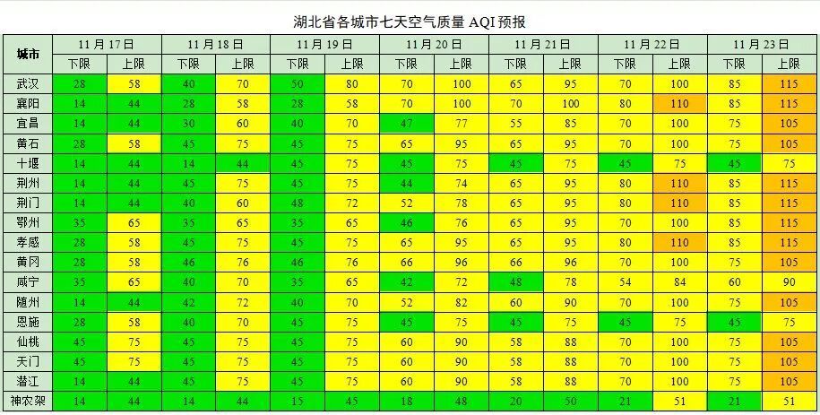 11月18日,湖北省生态环境厅发布最新空气质量预测:11月下半月湖北空气质量整体较好,上游污染传输风险较小,22-23日、25-26日受不利气象条件下的本地污染物积累影响,部分城市可能有轻度污染过程。