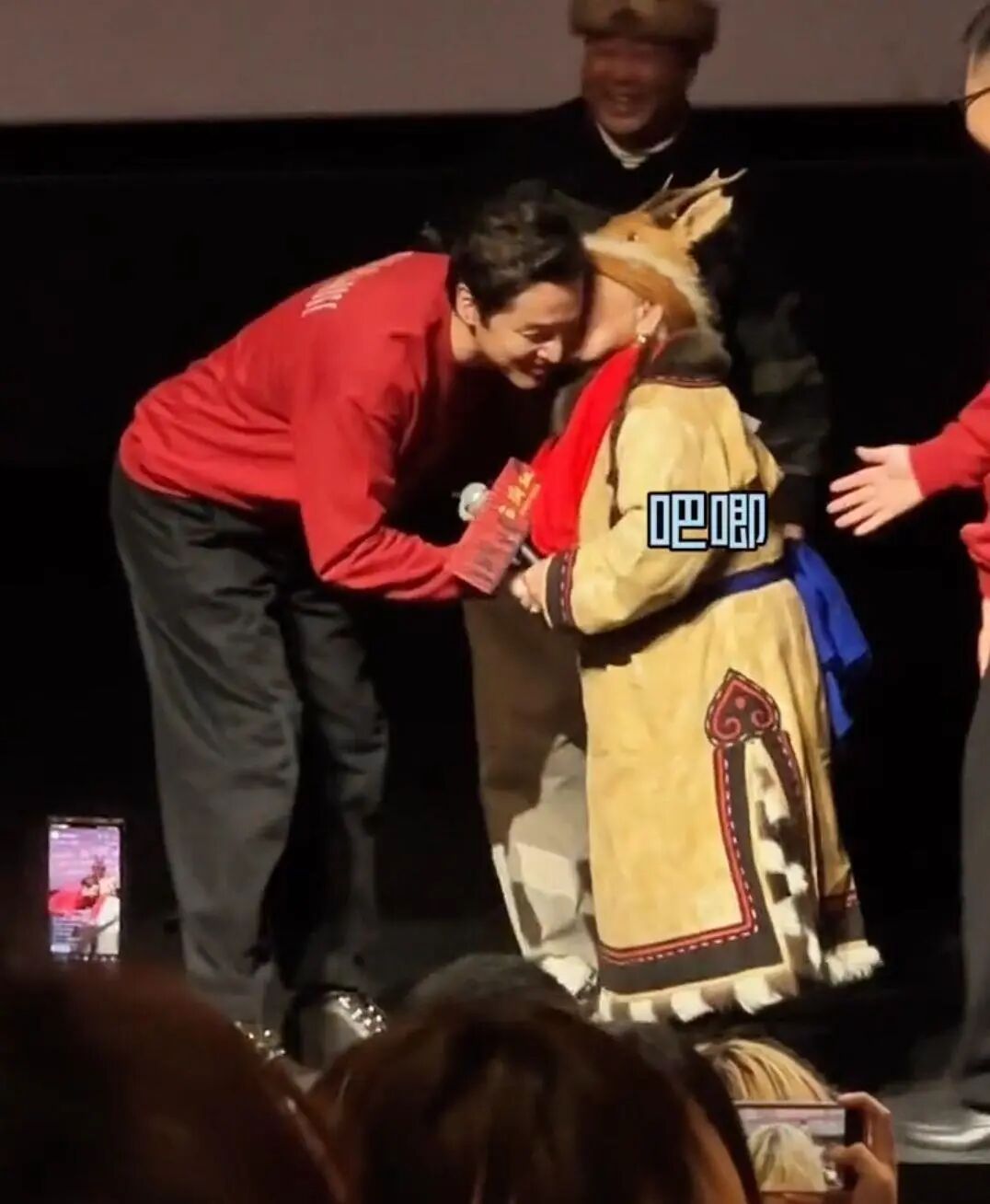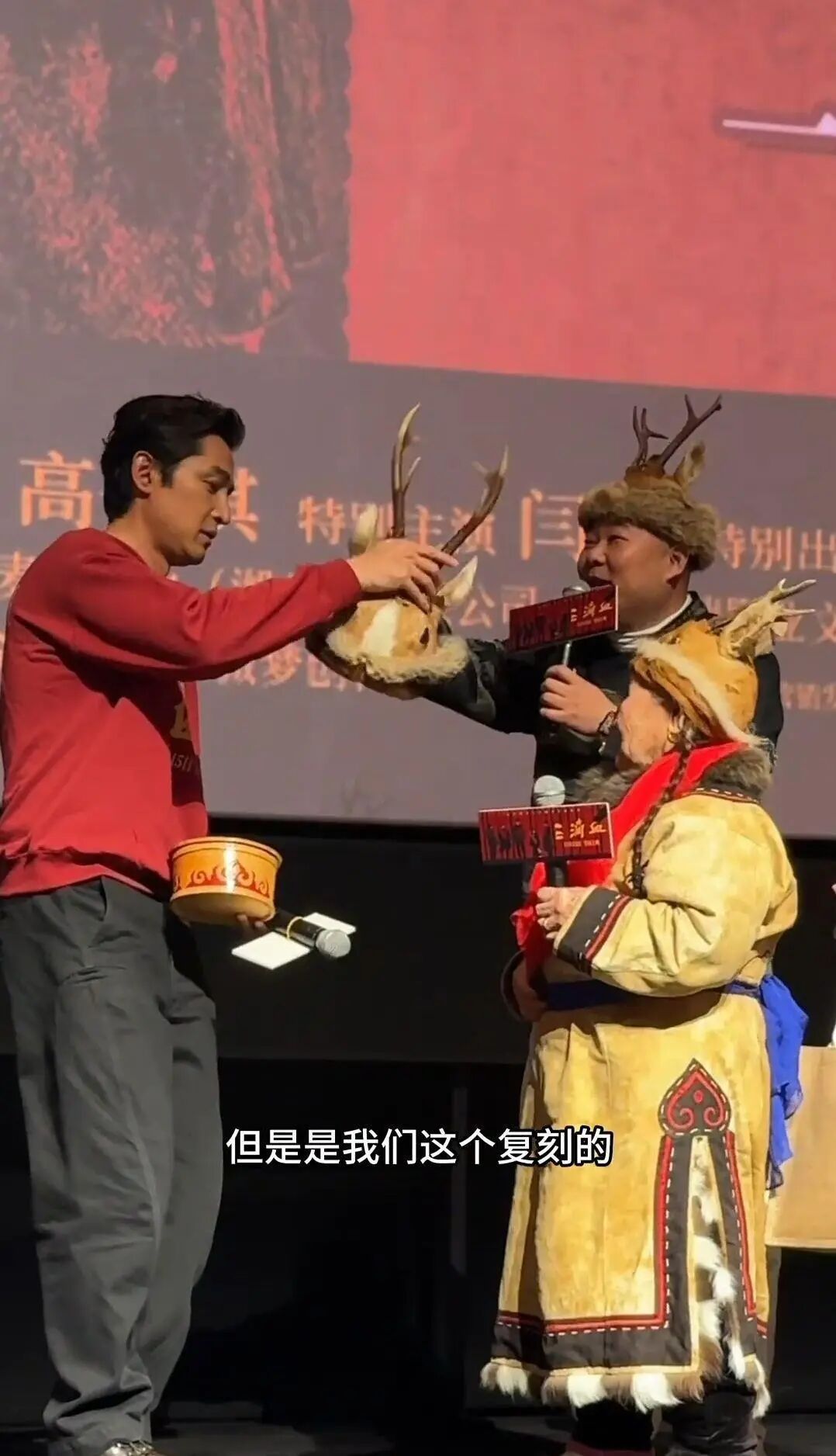 近日,电影《三滴血》首映礼上,内蒙古鄂伦春族非遗传承人“小花鹿奶奶”在现场将她亲手制作的桦皮盒与狍角帽(复刻版)赠予演员胡歌,奶奶还一脸慈爱地贴面吻了胡歌并向其说道“我们都喜欢你”。