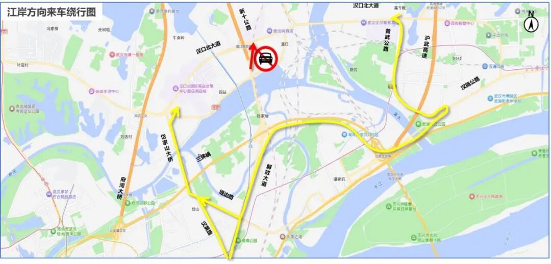 或者解放大道→三环线(往天兴洲大桥方向)→下汉施大道匝道→黄武公路→汉口北大道。