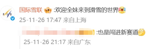 国际雪联官方社交平台赶来跟评:欢迎全妹来到滑雪的世界