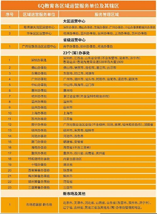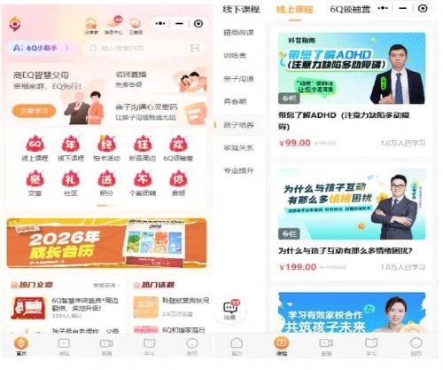 线下:截至2025年12月,6Q教育在全国设有2个大区运营中心(粤港澳大湾区运营中心、华东区运营中心),1个省级运营中心(广西壮族自治区运营中心),23个(筹)办事处,线下课程已传播至27个省级行政区(20个省、2个自治区、4个直辖市、1个特别行政区),共计影响116个城市。线下课程产品以家庭为中心,走进社区、学校、企事业单位,全方位地服务家庭有效应对家庭中的育儿问题、夫妻关系、婆媳关系问题,守护家庭的和谐生活。