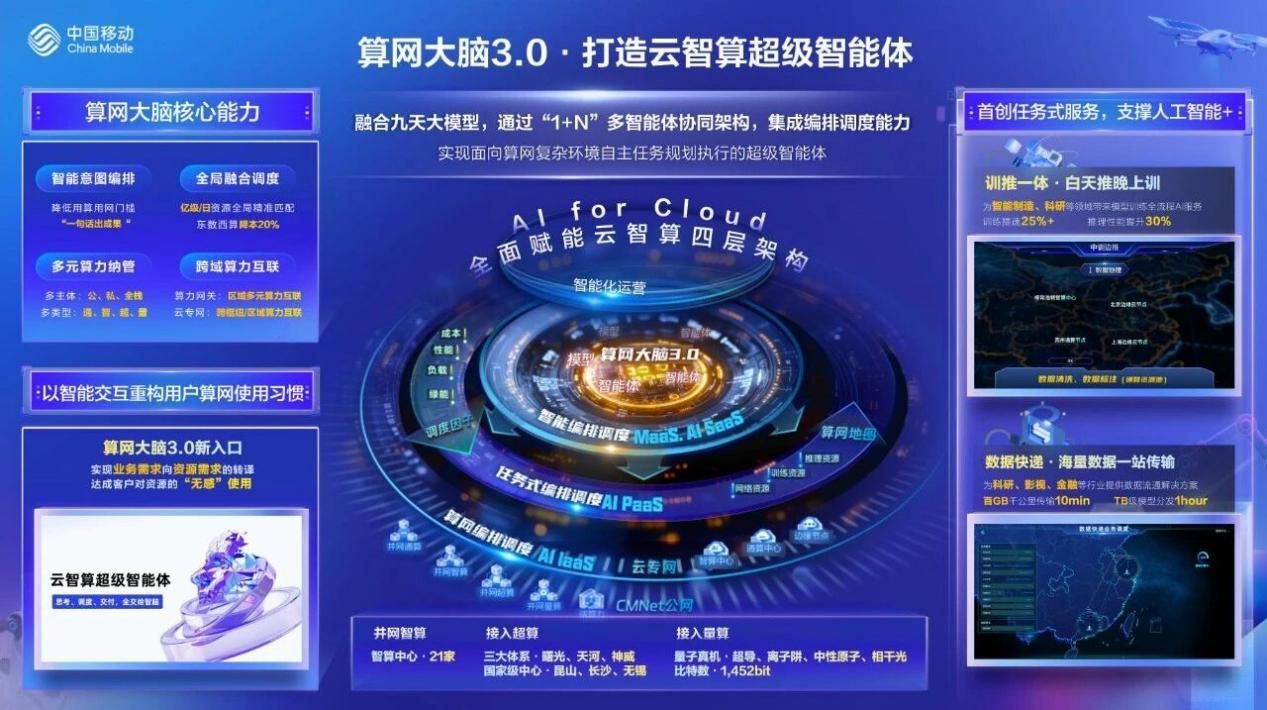 从AI For Cloud层面看,“算网大脑”升级为“3.0版本”,打造云智算超级智能体。算网大脑3.0协同各层专家智能体为客户提供高质量服务,为各层的专家智能体提供资源、任务、能力的编排调度能力。目前,算网大脑3.0已创新打造训推一体、数据快递、算电协同等20多项任务式服务,广泛应用于能源、政务、交通等重点领域,真正成为赋能“人工智能+”战略的超级智能体。