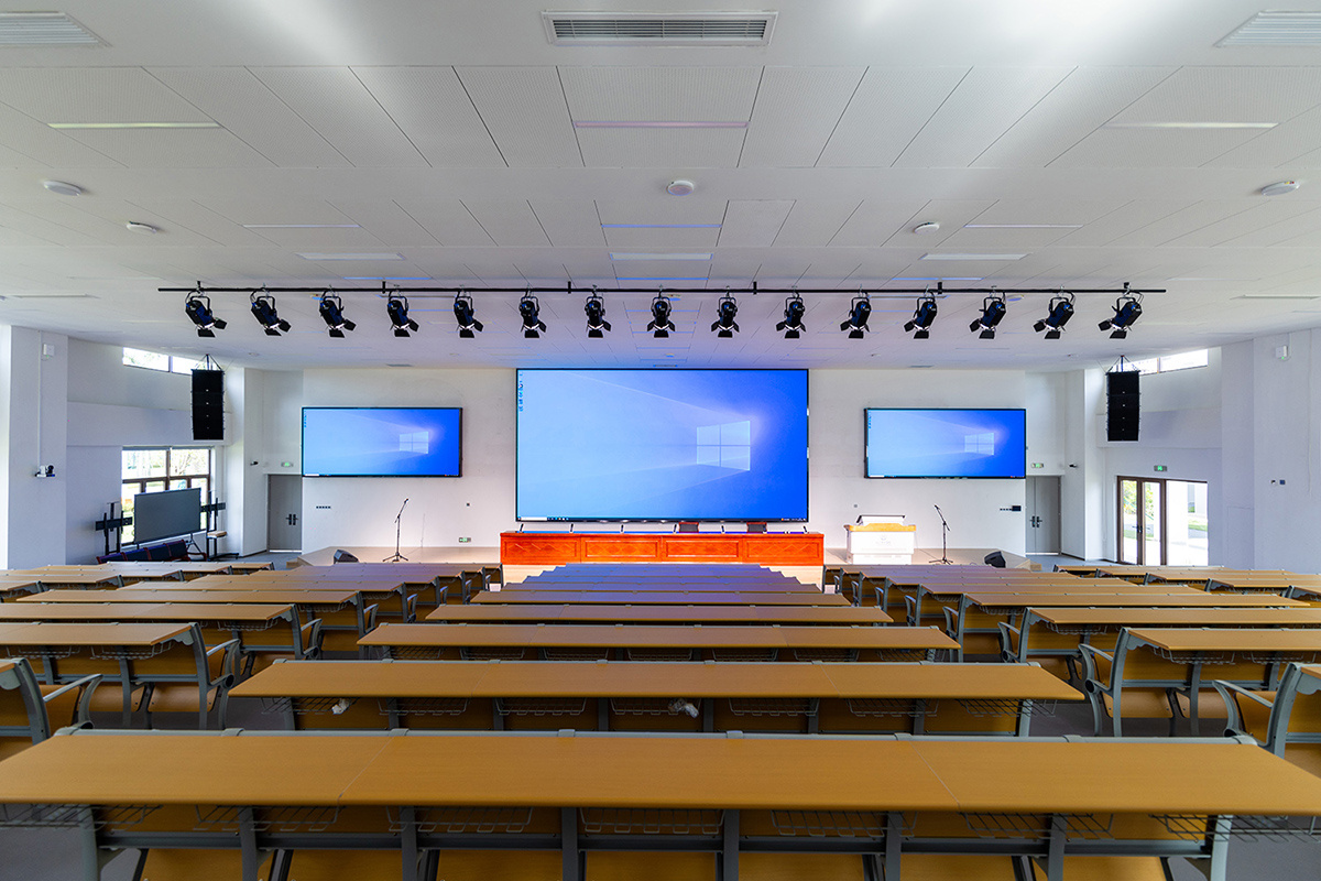 除了报告厅外,itc还为学校阶梯教室、多功能报告厅等区域打造高品质音视频系统,满足师生多样化的学习和活动需求。会议一体机、数字会议、LED显示屏、舞台灯光、专业扩声、录播、电子班牌、中控等设备的应用,使这些场所同样具备了现代化的教学与会议功能。这些智慧教学空间不仅满足了日常教学需求,还能支持远程视频会议、学术研讨、文艺演出等多种应用场景,构建起全方位、多层次的教育教学环境。