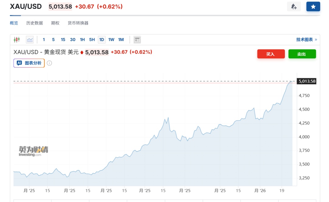 美国东部时间25日傍晚,纽约商品交易所2月黄金期货价格在电子盘交易中突破每盎司5000美元的历史性关口。