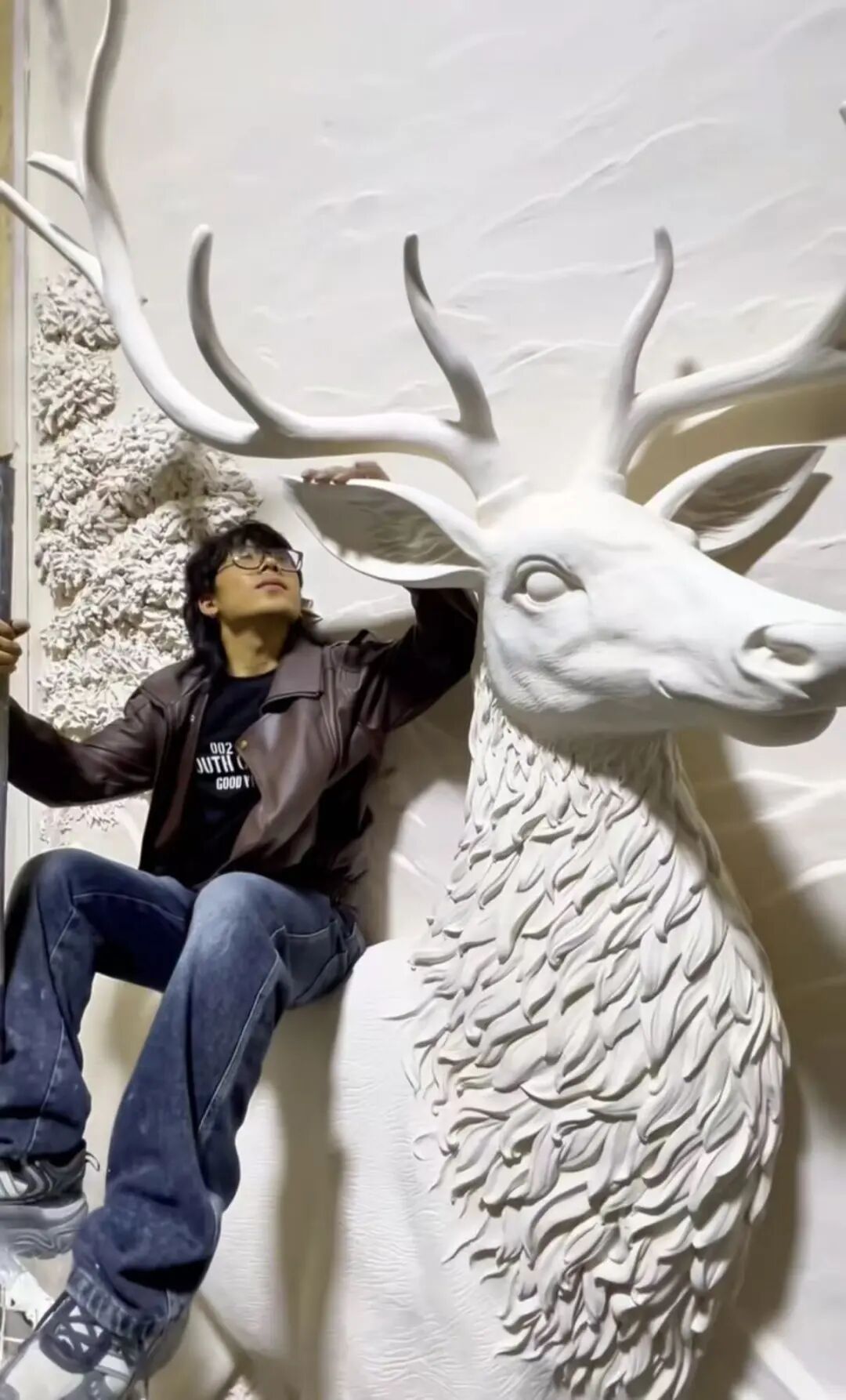 一条以“麋鹿”为主题的高浮雕视频在平台获得超百万播放量,成功破圈,也让更多人了解到,浮雕壁画不只是涂个腻子就可以的,而是有画线条初稿、电焊造型、安装电焊骨架、搅拌腻子、做背景浮雕、做主体造型、处理毛边、细节刻画、打磨上色等多个复杂步骤的专业工艺。