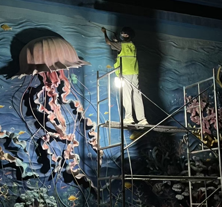 为了完成作品,他们付出了很大的努力。小郭原本恐高,但浮雕创作常需登上十几米高的脚手架,为了不拖累进度,他硬着头皮反复尝试,最终战胜恐惧。“现在已经不恐高了,刚开始还真是挺吓人,但我不能不上呀,总不能一直让小民上。”
