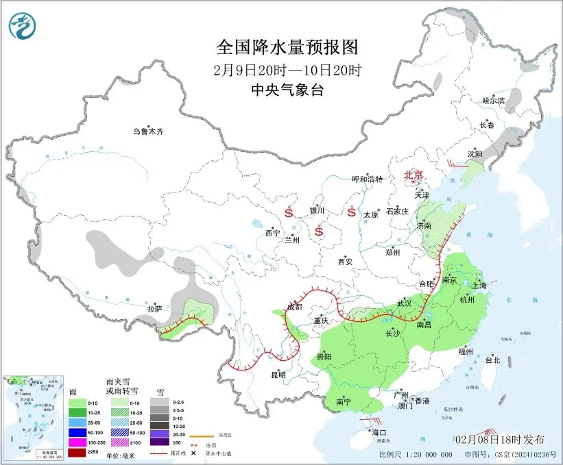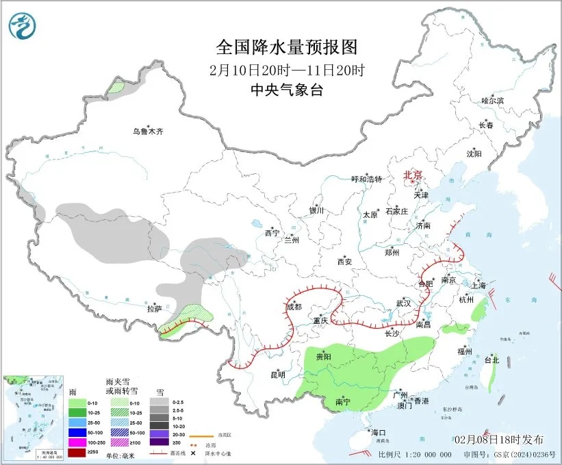 2月8日至10日,西藏东南部、西南地区东部、江汉、江淮、江南、华南西部和北部等地有小雨,其中,湖北西部、湖南北部等地将出现雨转雪或雨夹雪;新疆北疆、西藏东部、川西高原、甘肃南部、陕西南部、山西南部、山东等地部分地区有小雪或雨夹雪,局地有中雪。