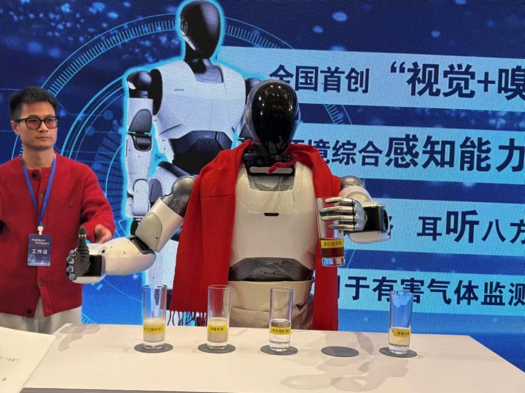 现场演示中,它快速分辨出透明容器中的白水、柠檬苏打水和白醋,精准的“嗅觉”赢得了阵阵掌声。