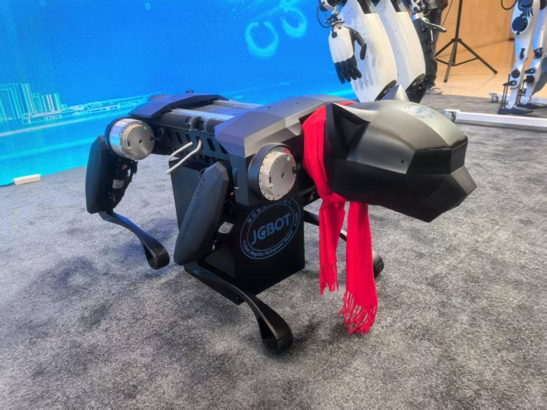 现场还有一台全球首款直线电机驱动四足机器人“机械豹”,负载超300kg,是目前全国负载最大的四足机器人。