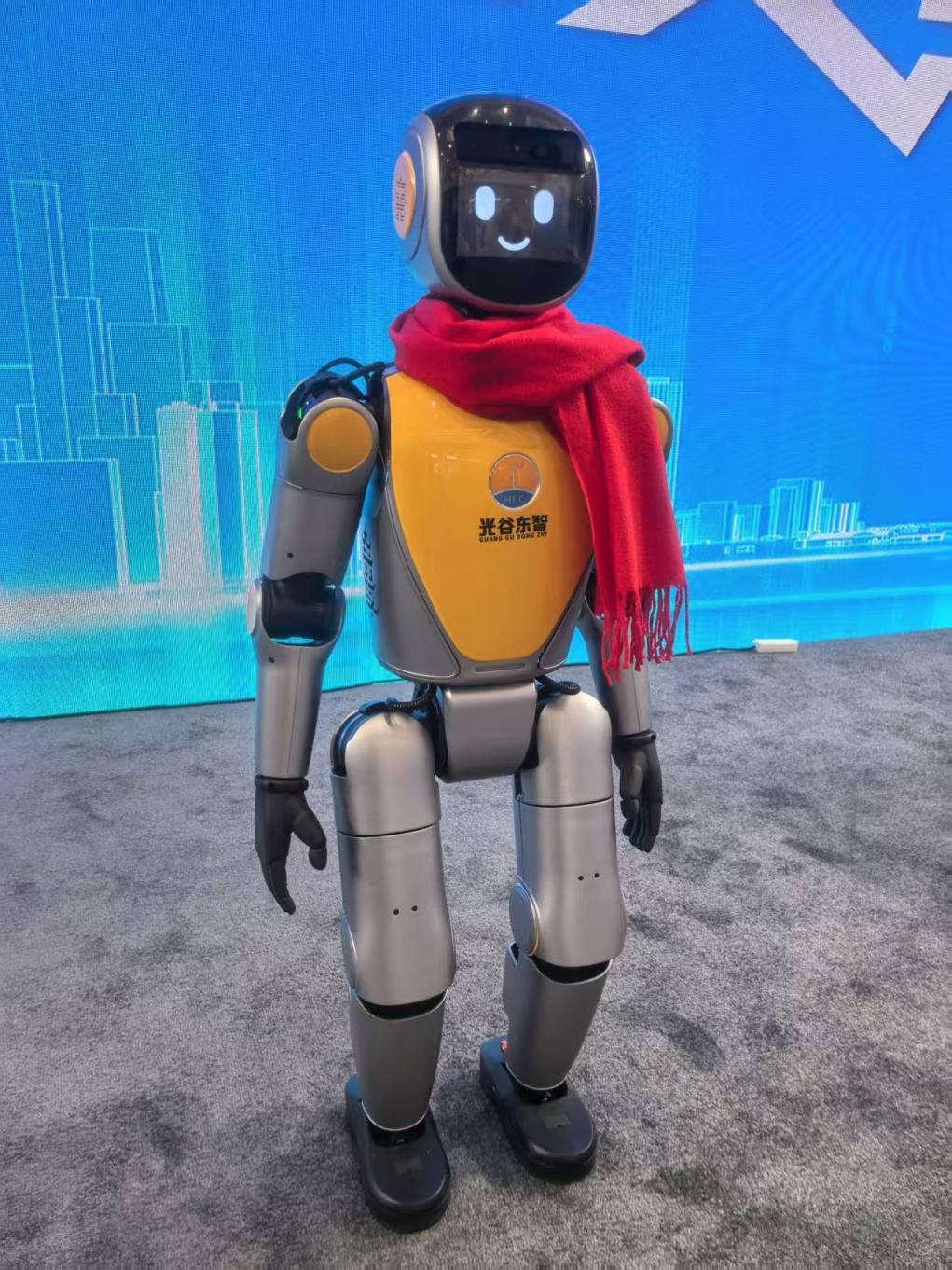 它们在现场翩翩起舞,动作流畅舒展,与小朋友配合默契,用灵动的姿态展现了湖北人形机器人的技术实力。