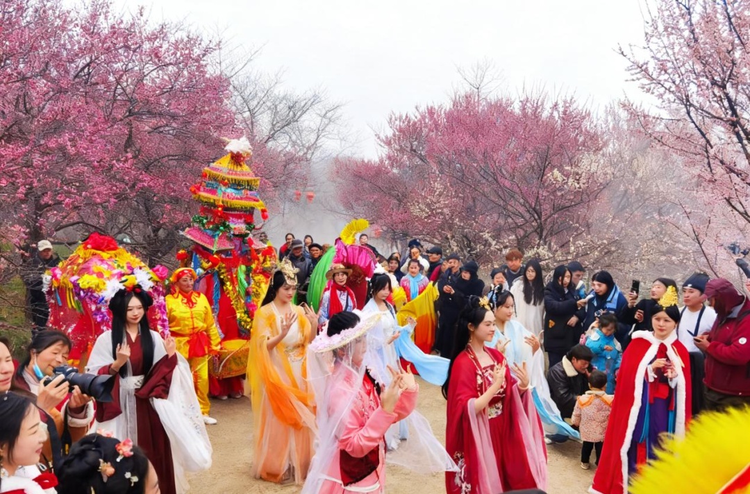 而在乡镇,年味同样浓烈。荆州区八岭山镇恒荣梅园腊月二十七推出“恒荣梅园楚风巡游”,将赏花经济与楚文化体验深度融合。460亩梅林间,楚服佳人漫步花海,琴师抚琴、书生吟诗、剑舞翩跹,游客在梅香与楚韵中感受“可游、可赏、可参与”的沉浸式体验。活动期间,舞狮、采莲船等民俗表演热闹开场,财神NPC派发福袋,更有相亲联谊、抖音打卡赢大奖等互动环节,让乡镇文旅不仅“有人气”,更有“新意”。