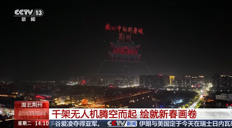 2月17日,荆州千架无人机腾空贺新春的震撼画面,亮相央视新闻频道《新闻直播间》;