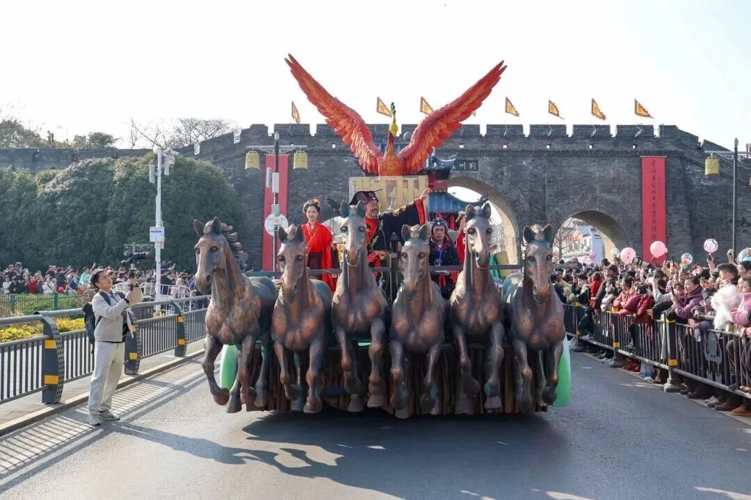 正月初三,荆州市荆州区荆南路上,“荆楚岁时记”年俗巡游队伍率先“起驾”。“天子驾六”领衔的楚王车马阵从历史深处驶来,将士手持长戟、神情肃穆,瞬间将游客拉回到“车辚辚、马萧萧”的战国时代。