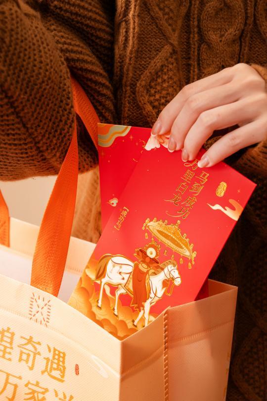 作为本次联名的核心周边,新春红包极具设计巧思,朱红底色呼应马年朝阳之姿,神马腾跃的灵动身影与敦煌经典卷草云纹相映成趣,方寸之间既流淌着千年敦煌文脉,也承载着马年顺遂、阖家安康的美好期许,既是传递心意的节日载体,也是兼具颜值与收藏价值的文化小物。