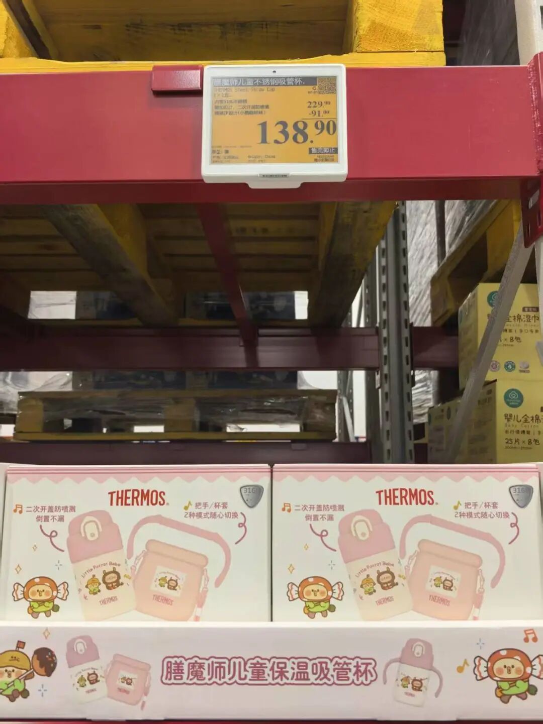 现场,不少商品都贴上了“好物立省”的黄色标签,包含日化、服装、食品等多个品类。其中一款膳魔师儿童不锈钢吸管杯原价229.9元,优惠91元,实价138.9元,优惠后的价格相当于原价的60%。
