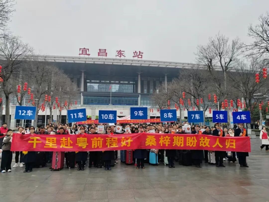 近日,“春风送岗·情暖归途”2026年宜昌市赴粤务工人员“点对点”返岗专列欢送仪式在宜昌东站顺利举行。宜都市精心组织13名务工人员搭乘G1142次免费专列(宜昌东至广州南)返岗复工。当日9时40分,列车准时发车,务工人员带着家乡关怀顺利踏上南下征程。