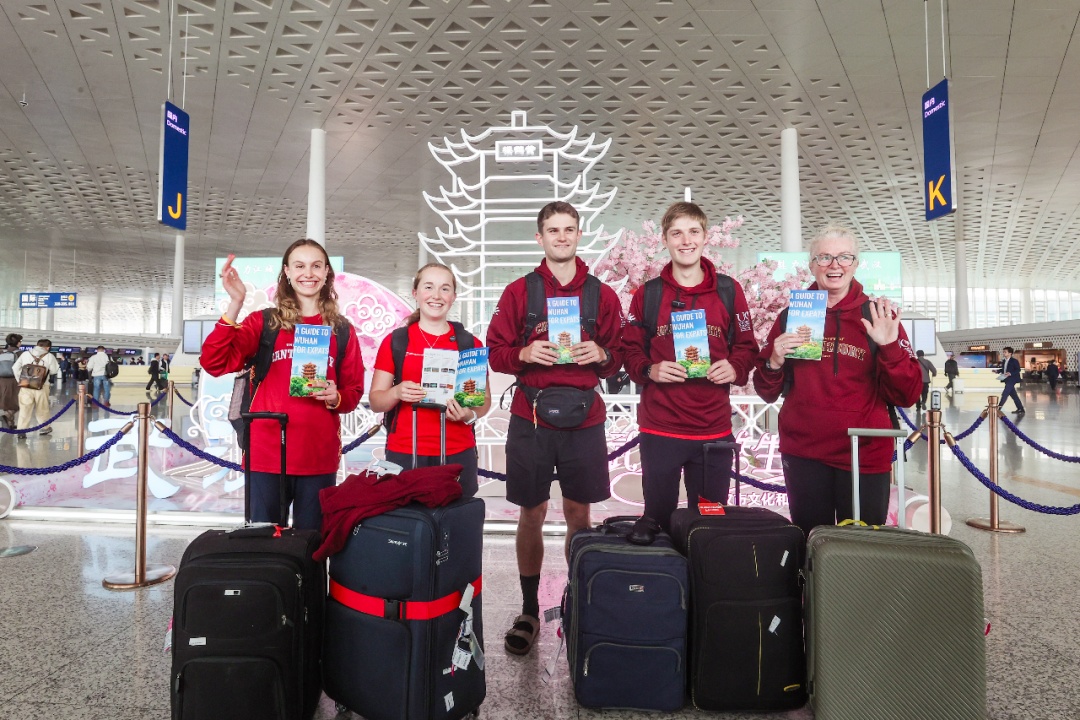 在武汉天河国际机场,来自新西兰坎特伯雷大学的选手拿着《外籍人士在汉指南》。