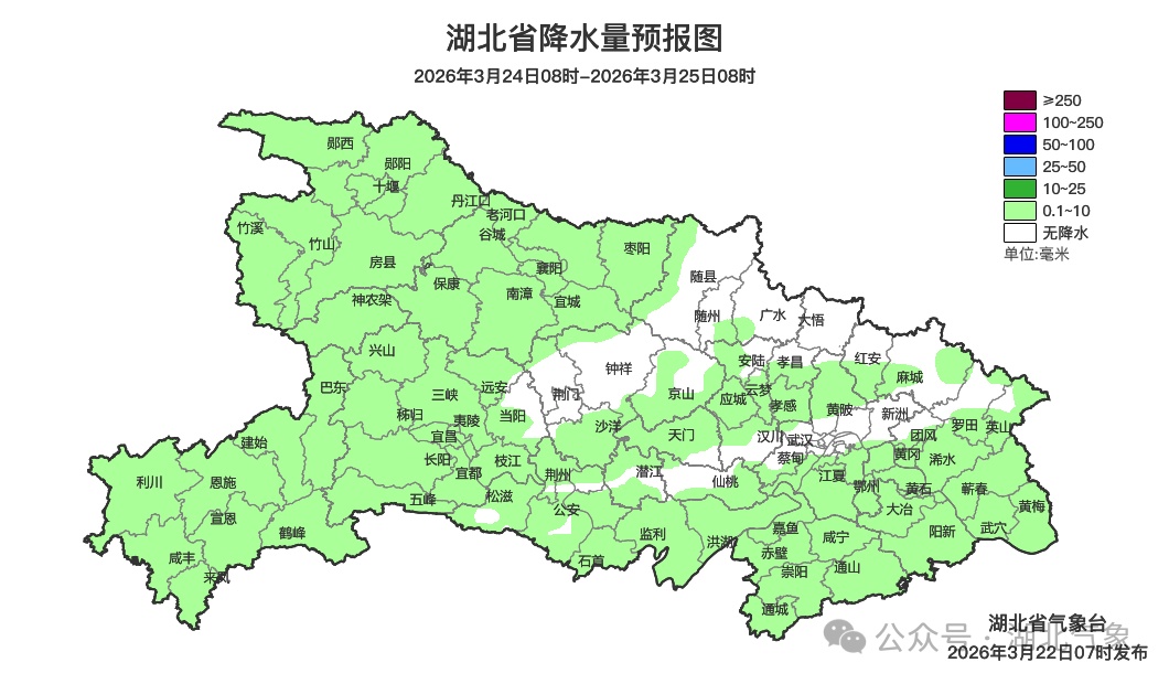 3月24日08时-25日08时:鄂西北、鄂西南、江汉平原南部、鄂东南、鄂东北南部小雨转多云;其他地区阴天到多云,局地有短时零星小雨。最高气温西部13~16℃、中东部16~19℃,最低气温鄂西北6~9℃、其他地区9~12℃,偏北风3到4级,夜间转2到3级。