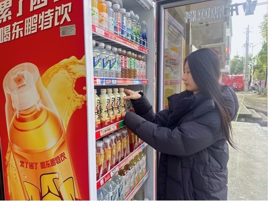 唐子悦帮杜文华整理饮料柜。