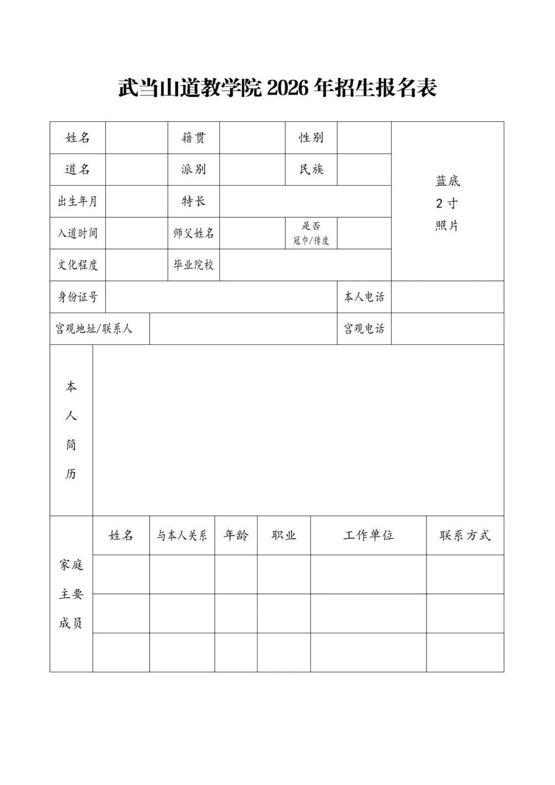 1、《武当山道教学院2026年招生报名表》一份。