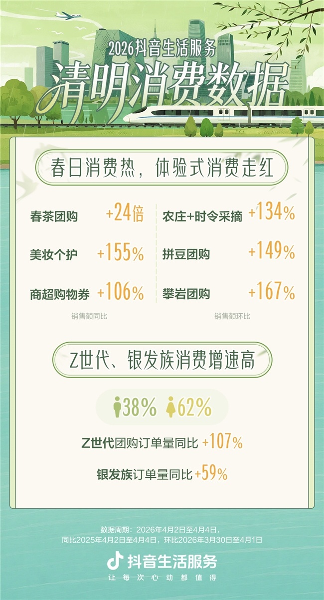 清明假期落幕,赏花游、乡村游、体验式消费迎来高潮。抖音生活服务清明消费数据显示,“春日Color Walk”相关话题突破7.5亿次,假期抖音团购销售额同比增长54%。其中,餐饮团购销售额同比增长超42%,休闲娱乐相关团购销售额同比增长76%,酒旅团购销售额同比增长38%、环比节前增长54%。赏花踏青之外,餐饮、住宿、休闲娱乐、零售等多业态消费也在同步升温。