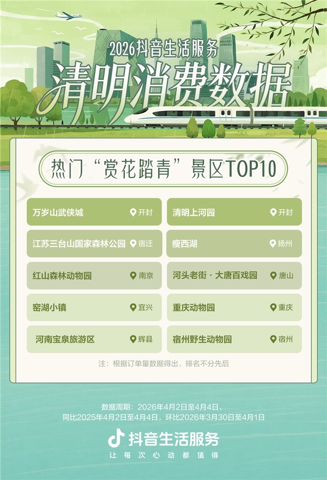 “赏花踏青”景点迎来客流高峰。清明假期,抖音景区团购订单量环比增长98%。开封万岁山武侠城、开封清明上河园、江苏三台山国家森林公园、扬州瘦西湖、南京红山森林动物园、唐山河头老街·大唐百戏园等入围“10大热门赏花踏青景点”。返乡祭祖带动抖音乡村景点订单量环比增长157%,上饶婺源篁岭风景区、枣庄台儿庄古城、保定易县狼牙山田园花海、铜陵犁桥水镇、湖州太湖演艺城入围成“5大热门乡村目的地”。