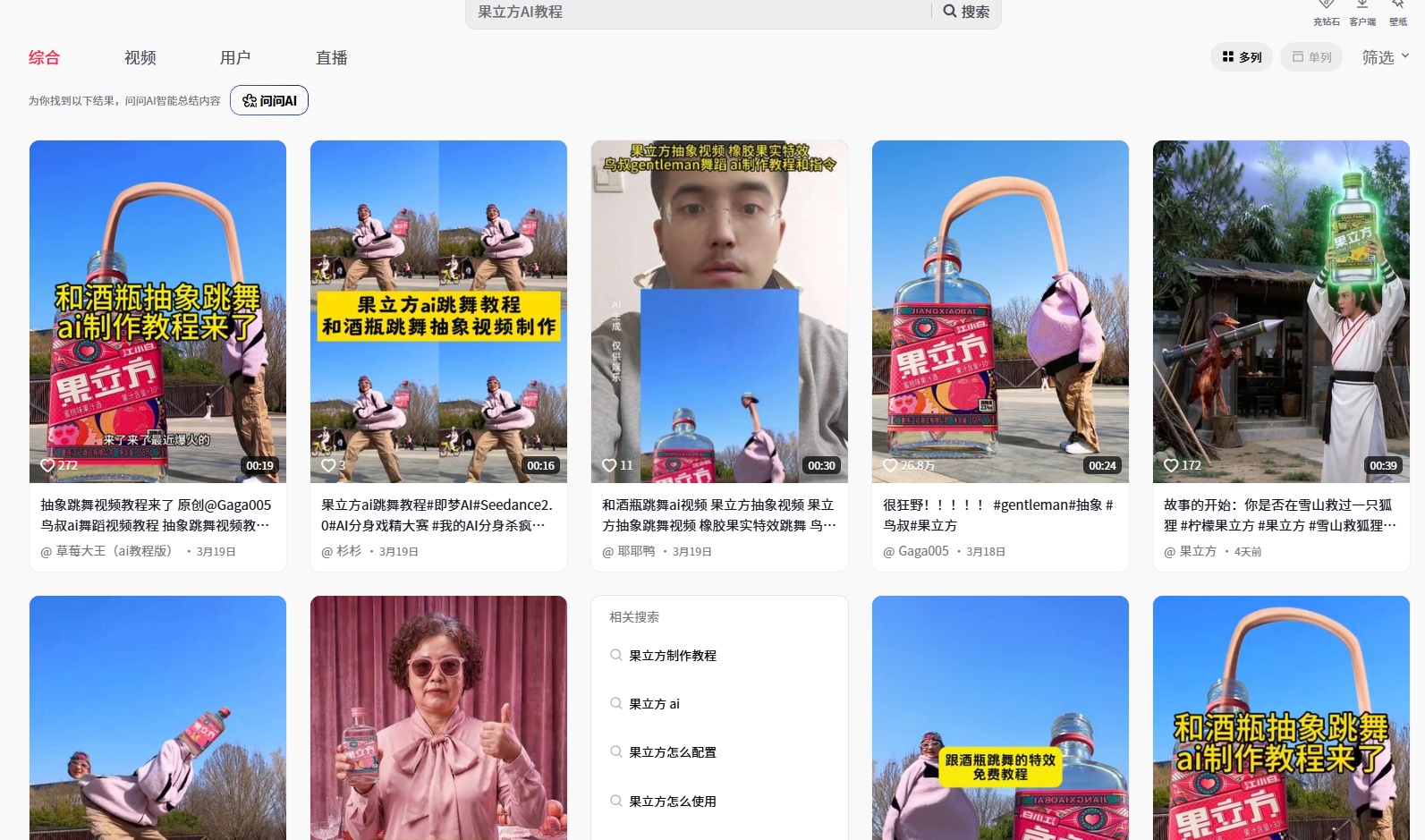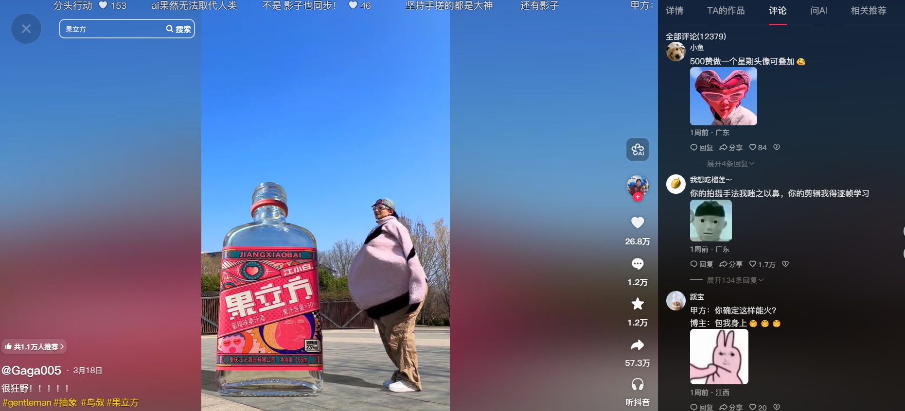 起初,只是一个名为“Gaga005”的内容博主突发奇想,尝试用AI制作抽象视频:把果立方放在户外广场上,并把酒瓶夸张放大,然后让果立方与自己跳舞抽象互动。画面风格充满荒诞感与视觉冲突。