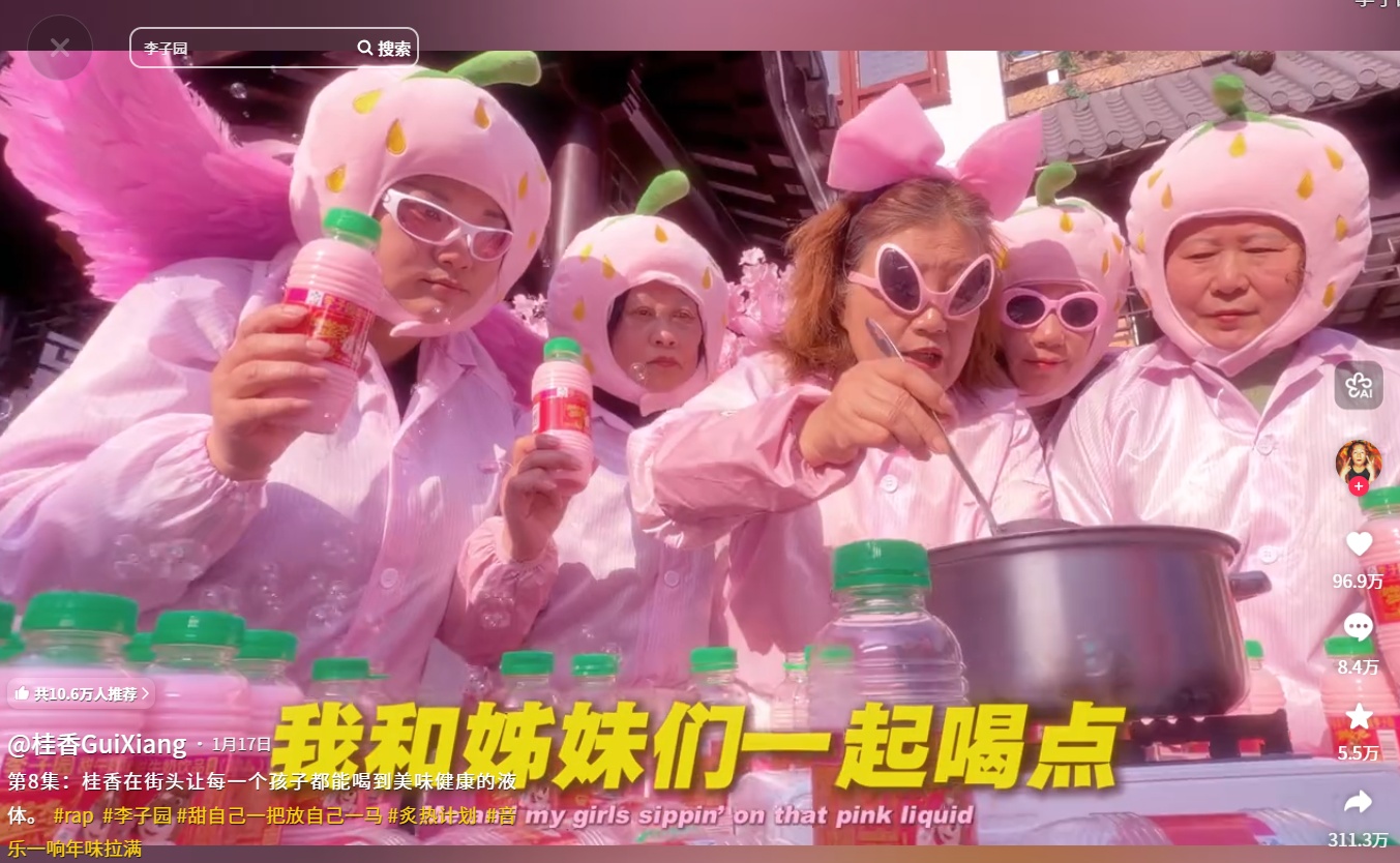 MV中,桂香阿姨穿着粉色服装,用带有浓重方言味儿的普通话唱道:“我和姊妹们一起喝点粉色的液体,一种甜甜的液体,一种粉色的液体……”