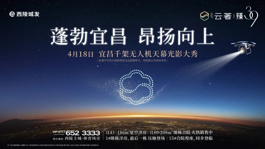 西城云著始终以top 级品质,为宜昌层峰打造真正的传世藏品。“蓬勃宜昌·昂扬向上”宜昌千架无人机天幕光影大秀,4月 18日,滨江公园璀璨启幕,不仅是一场视觉狂欢,更是一次城市与项目、理想与生活的深度对话,我们诚邀宜昌全城市民共赴一场关于美好、关于云端、关于理想生活的盛大之约。