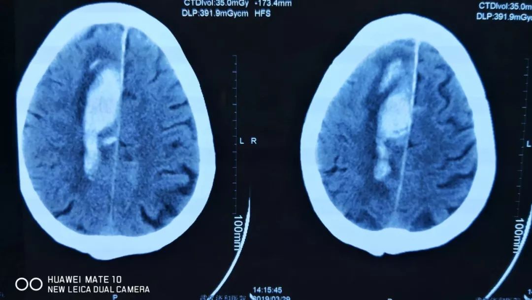 经了解,李爹爹在家时突发晕厥,摔倒在地,左侧肢体瘫痪同时伴有言语不清。继而出现呕吐,急来我院就诊。经查头颅CT提示右侧顶叶大面积脑出血。