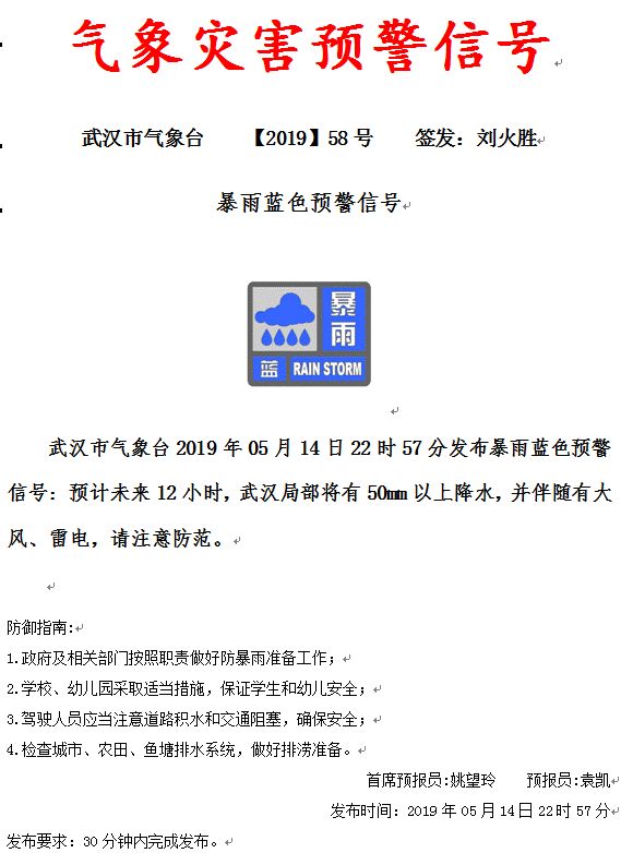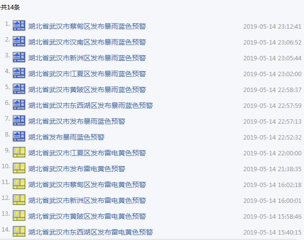 总共14次暴雨和雷电预警