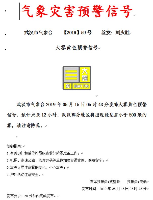刚刚,武汉市气象台发布了大雾黄色预警。开车出门请一定小心驾驶!