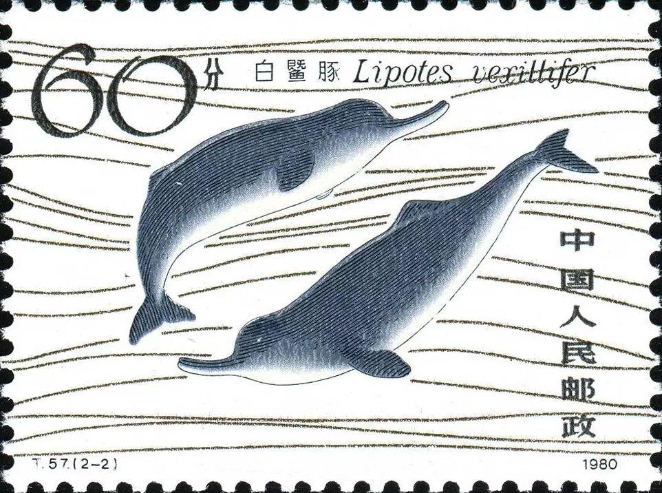 1980年12月15日,由中国著名的邮票设计师刘硕仁先生设计的《白鱀豚》特种邮票正式发行,全套2枚,采用版画风格,以“悠然自得”与“环游潜底”为主题,分别展现了白鱀豚穿梭于大江之中的生活习性与在江底玩耍嬉戏的场景。邮票简洁大方,用金线和银线表现水波纹更是别具匠心,令人称奇。