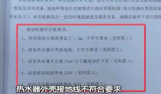 303房间浴室插座安装高度不符合要求,热水器外壳接地线不符合要求,热水器未安装漏电保护开关。