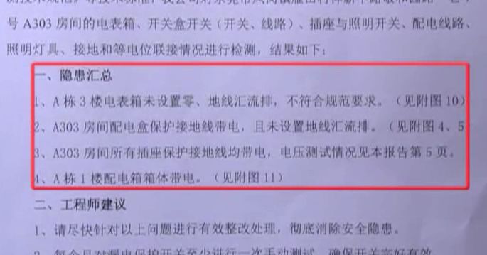 A303房间配电盒及所有插座保护接地线均带电,A栋1楼配电箱箱体带电。