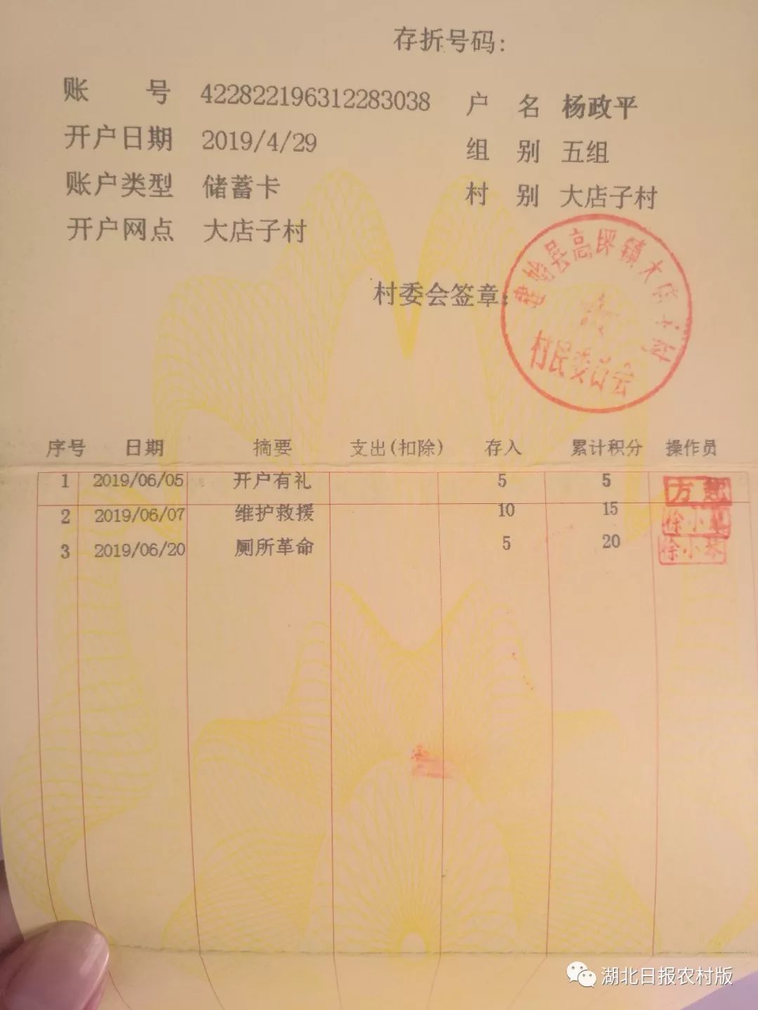 7月25日,建始县高坪镇大店子村村民杨政平走进村委会,拿出村级“文明银行”乡风文明积分存折,取出5个积分,“买”了2块洗衣皂。他的存折里,有20多个积分,是靠完成无害化厕所改造、义务参加车祸救援挣来的。