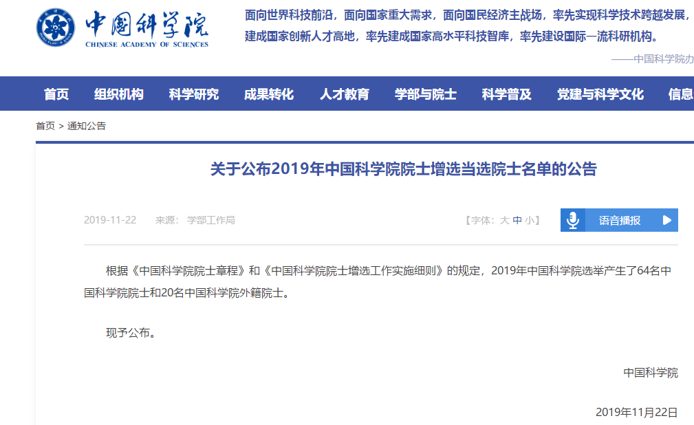分别公布了2019年新增院士名单