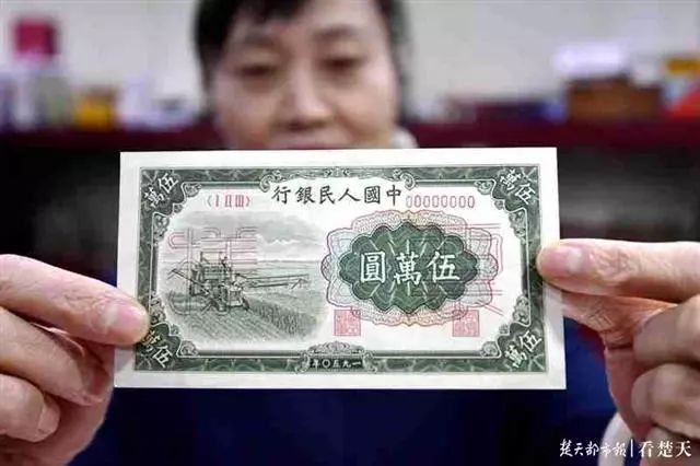 店主杜爱国告诉记者,收藏界把这两张纸币分别称作“五万元新华门”和“五万元收割机”。“新华门”由北京印钞厂承印,印刷于1950年,发行于1953年,流通时间仅1年3个月;“收割机”流通时间也只有1年4个月。