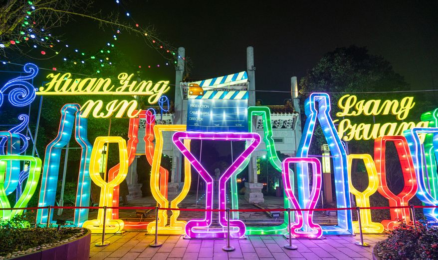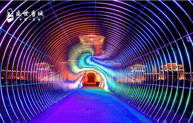 到了夜晚,这里将上演一场灯与火的盛宴,时光隧道、双凤呈祥、十二生肖汇集成璀璨灯光。