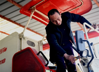 近日,渔洋镇谢小村一组贫困户黄忠伟在保养联合收割机。黄忠伟家是该组21个贫困户之一,他家因病致贫。去年该村村委委员根据他的特长,出面担保为他争取货款资金,先后购买了收割机、旋耕机、东风牌农用汽车等,使他成功脱贫,并成为远近闻名的农机专业户、新兴经济主体带头人。据悉,去年他利用农机创收获收入12万余元。