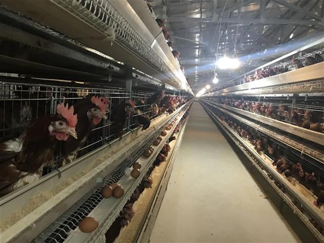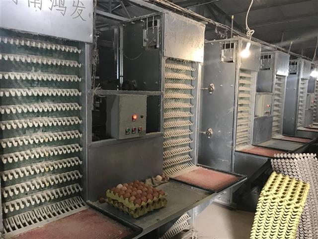 走进周柏海的鸡舍,只见一排排母鸡整齐的从钢柜里探出小小的头,在食槽里觅食,圆眼睛、红鸡冠、小尖嘴萌态十足,分外可爱。每排鸡群的下端都有一行传输带接住母鸡们生下的鸡蛋,再将蛋传输至钢柜一边的自动拣蛋机里,不一会,鸡蛋就自动分拣成30枚/隔的鸡蛋隔。