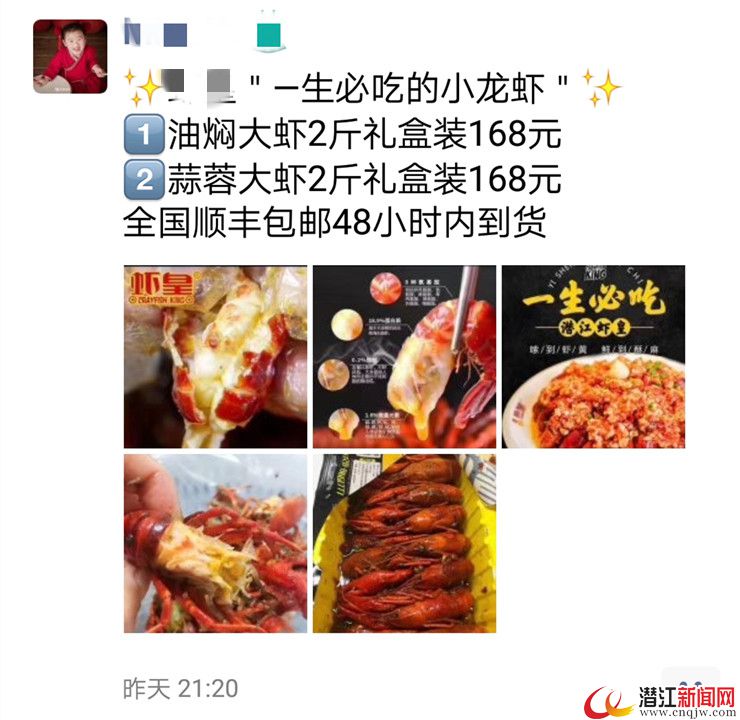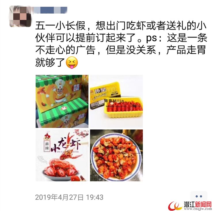 在采访过程中,记者了解到,小龙虾微商代理无压货风险,商家支持一件代发,全程顺丰冷链,工厂直发。小龙虾代理们只需接单,售后问题也由商家负责。在这种模式下,小龙虾微商经营者们日渐增多,微信朋友圈给喜爱潜江本地小龙虾的食客带来了新的选择。(记者 谭欣)