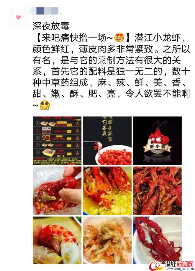 “前年夏天外地的朋友来潜江吃完虾后,看到虾店里面有卖包装好的成品虾,便一人提了一份回去,我当时就想到了在微信上卖虾市场应该不错,后来便通过朋友了解到,现在潜江很多虾店的成品小龙虾用专业的生鲜标准包装后,通过快速的航空服务,可以在隔日邮寄到各地,到手的小龙虾不仅新鲜,而且味美。”一位90后小龙虾微商经营者孙先生说。